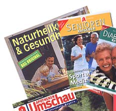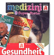 Diese Zeitschriften erhalten Sie jeden Monat bei uns in der Apotheke. Sie liegen kostenlos zum Mitnehmen für Sie bereit. Jeden Monat gibt es wertvolle Tipps und Erklärungen rund um die Gesundheit.